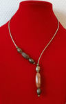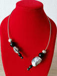 2019Hanger gemaakt van zilverkleurig Aluwire om een zwartglazen steen gebogen, met rubberen ketting
